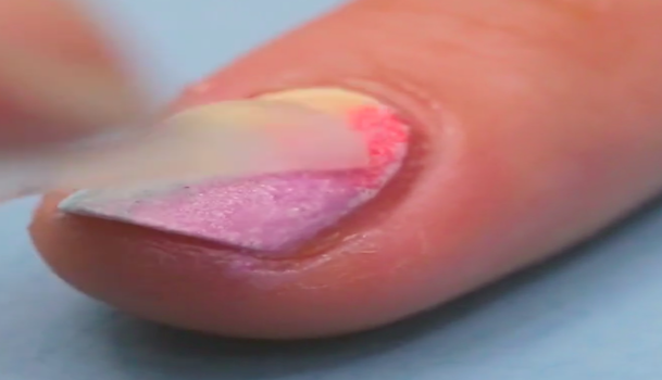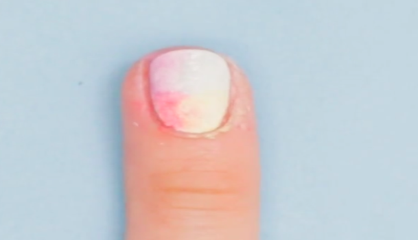 スポンジを使ってカラーマニキュアを塗っていきます。今回使用するのはレッド、イエロー、ブルー、パープルの4色。また、スポンジは100均などに売っているものでオーケーです。小さめに切ったスポンジにマニキュアを塗り、優しくポンポンと爪をたたいていきます。