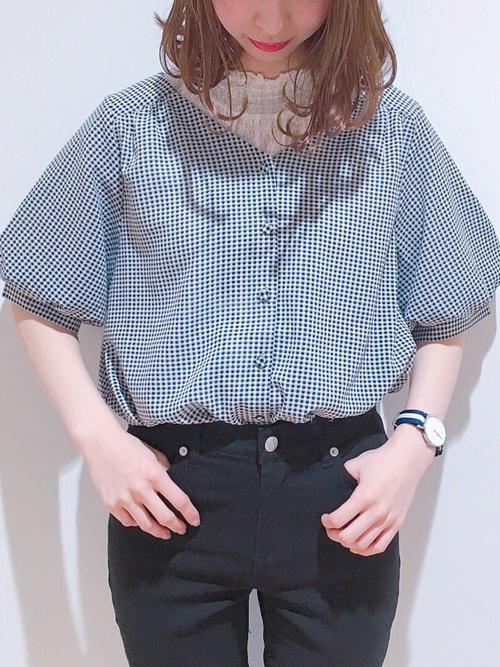 ガーリーなチュニックにはギンガムチェックのスキニーパンツを!上がふんわりとしているぶん、ボトムをスキニーでタイトに仕上げるのがメリハリコーデのコツです。