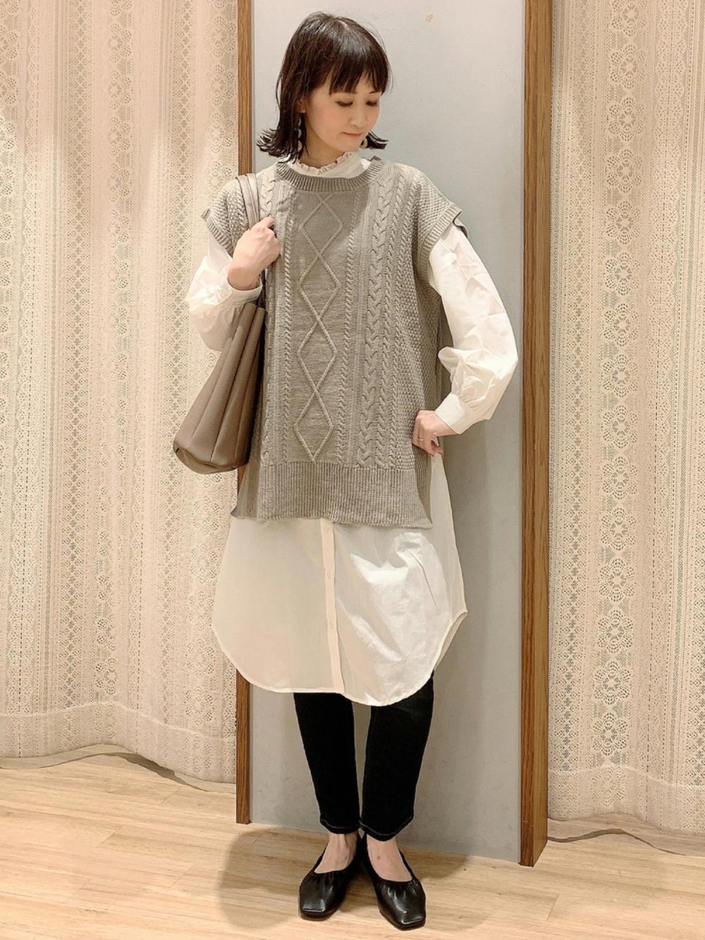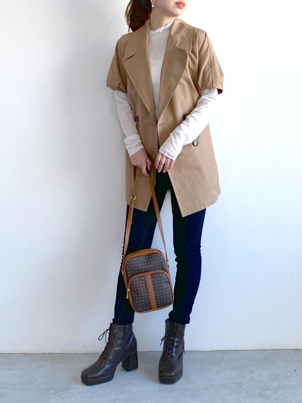 お尻の位置が低く、お尻が垂れて見えてしまうのが気になる方は羽織をプラスすると◎お尻が隠れる長さの羽織で隠してしまいましょう!今、大人気のジレを合わせるとトレンド感もアップ♪