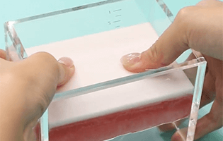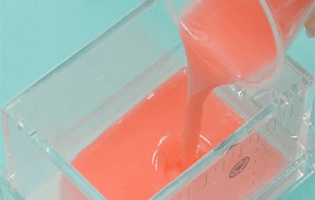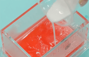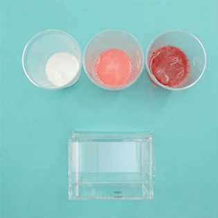 2層目の石鹸が固まったら、3層目を流し込んでいきます。こちらのカラーは、クリア―のソープ125gに食紅を混ぜて作ることができます♪
