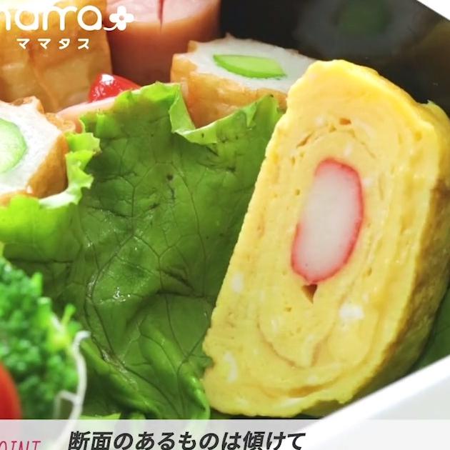 卵焼きなど断面のあるものは、傾けて断面が上から見えるようにすると華やかな印象になりますよ。