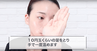 化粧水を手のひらに出したら、両手で軽く温めます。10円玉くらいの大きさをイメージして手のひらに化粧水をのせましょう◎