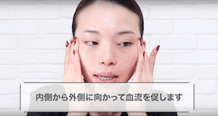 顔の内側から外側に手のひらをスライドさせて、血流を促します。目の下から順番に、最後はあごから耳の下まで、上から下にリンパを流すイメージでやると◎