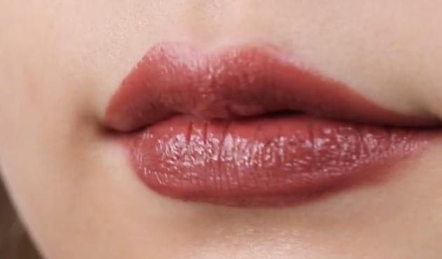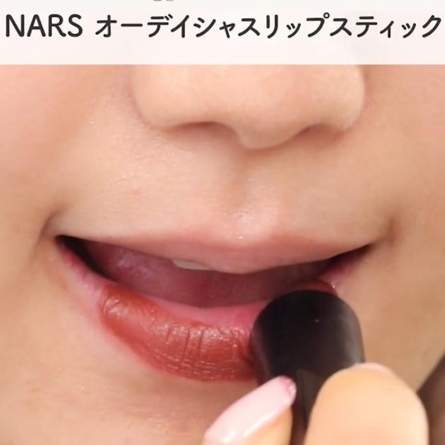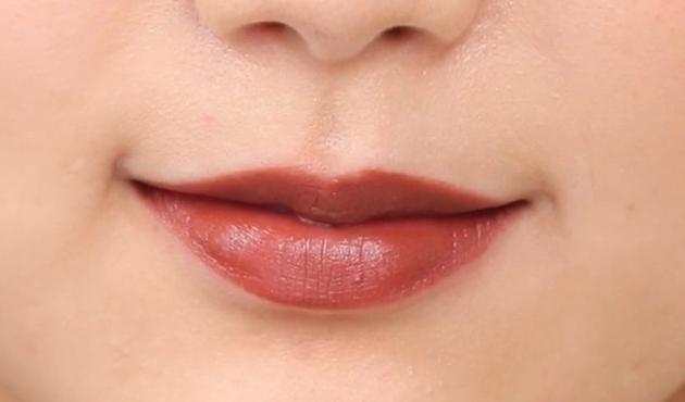 ここでボルドーが登場!唇は濃い色で引き締めます。こちらのマットリップはかなり濃い色なので、唇を優しくポンポンとたたくようにして色をつけましょう。