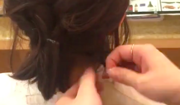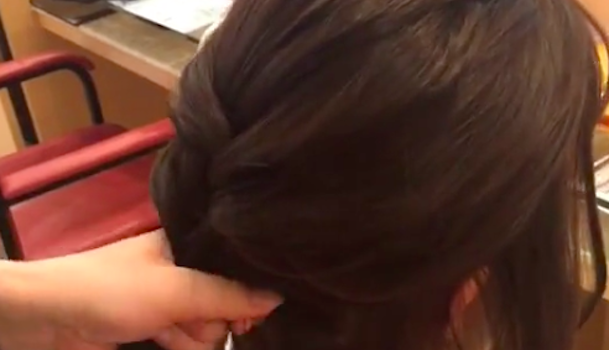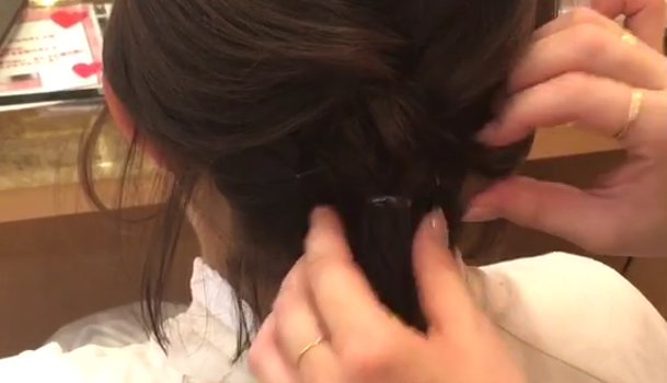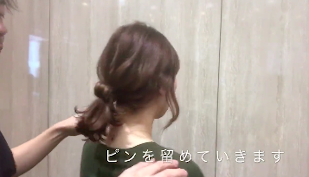 くるくると巻いた毛束に、左右からピンを差し固定します。