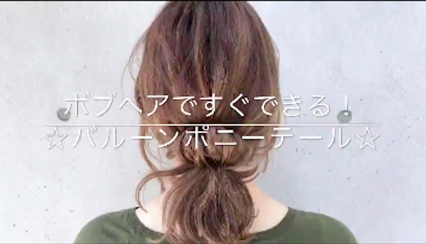 ボブヘアだからこそ出来る、かわいいまとめ髪スタイルを紹介します♪その名も「バルーンポニーテール」。結び目部分に、風船のようにくるんと毛束があるのが特徴です。カジュアルな服装にも、きちんとした服装にも合う万能ヘアアレンジなので、ぜひマスターしてみてくださいね!はじめに髪全体をゆるく巻いておくとアレンジがしやすいですよ。