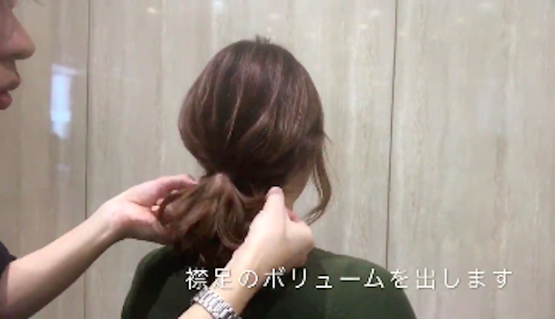 顔まわりの後れ毛を残し、髪の毛をひとつにまとめます。片手で毛束を持った状態で、少しずつ毛束を引き出しルーズ感を出します。