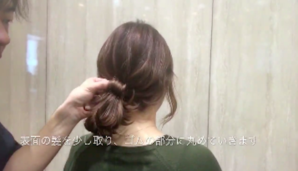 ポニーテールになっている毛束の表面を少し取り、結び目に向かってくるくる毛先から巻いていきます。親指が通るくらいの太さに巻きましょう。