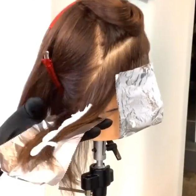 アルミホイルを髪の下にひき、ホワイトハイブリーチ剤を根元をあけて耳横に塗っていきます。