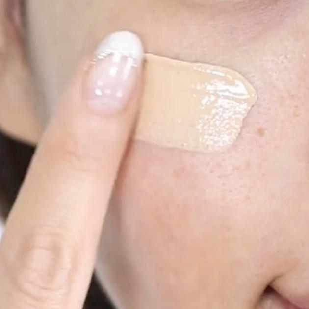 リキッドファンデーションを内から外に向かって伸ばします。くすみやすい目周り、小鼻、口角は重ねづけすると◎