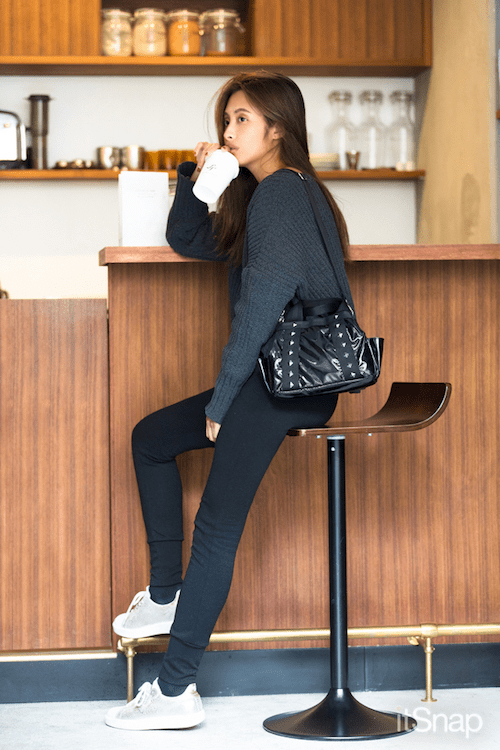 秋らしい黄色いロングスカートは、グレーのスニーカーとクラッチバックでまとまり感のあるシンプルコーデに。思わず紅葉と一緒に写真に残したくなっちゃうようなかわいいコーデです。