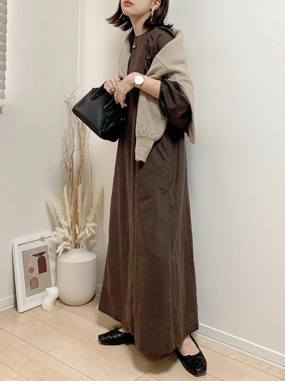トーンの深いブラウンワンピを合わせることで、甘すぎない大人っぽいコーデに♪ベージュのカーディアンで抜け感をプラスできちゃいます!