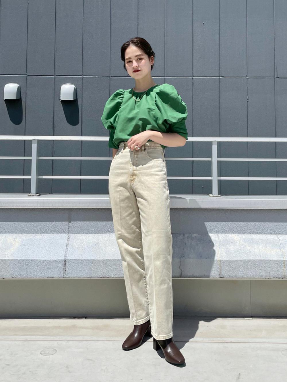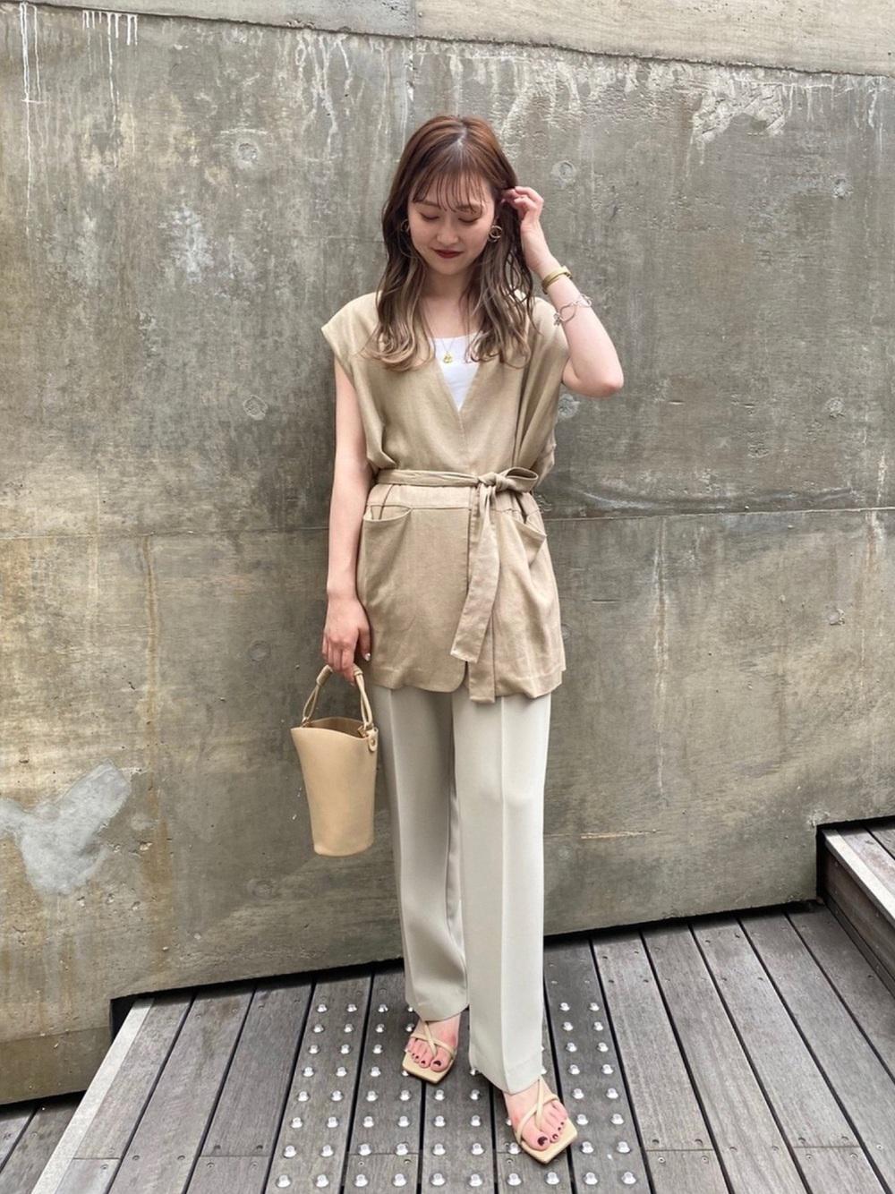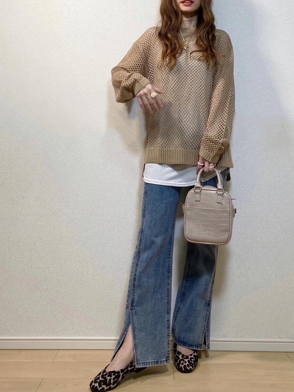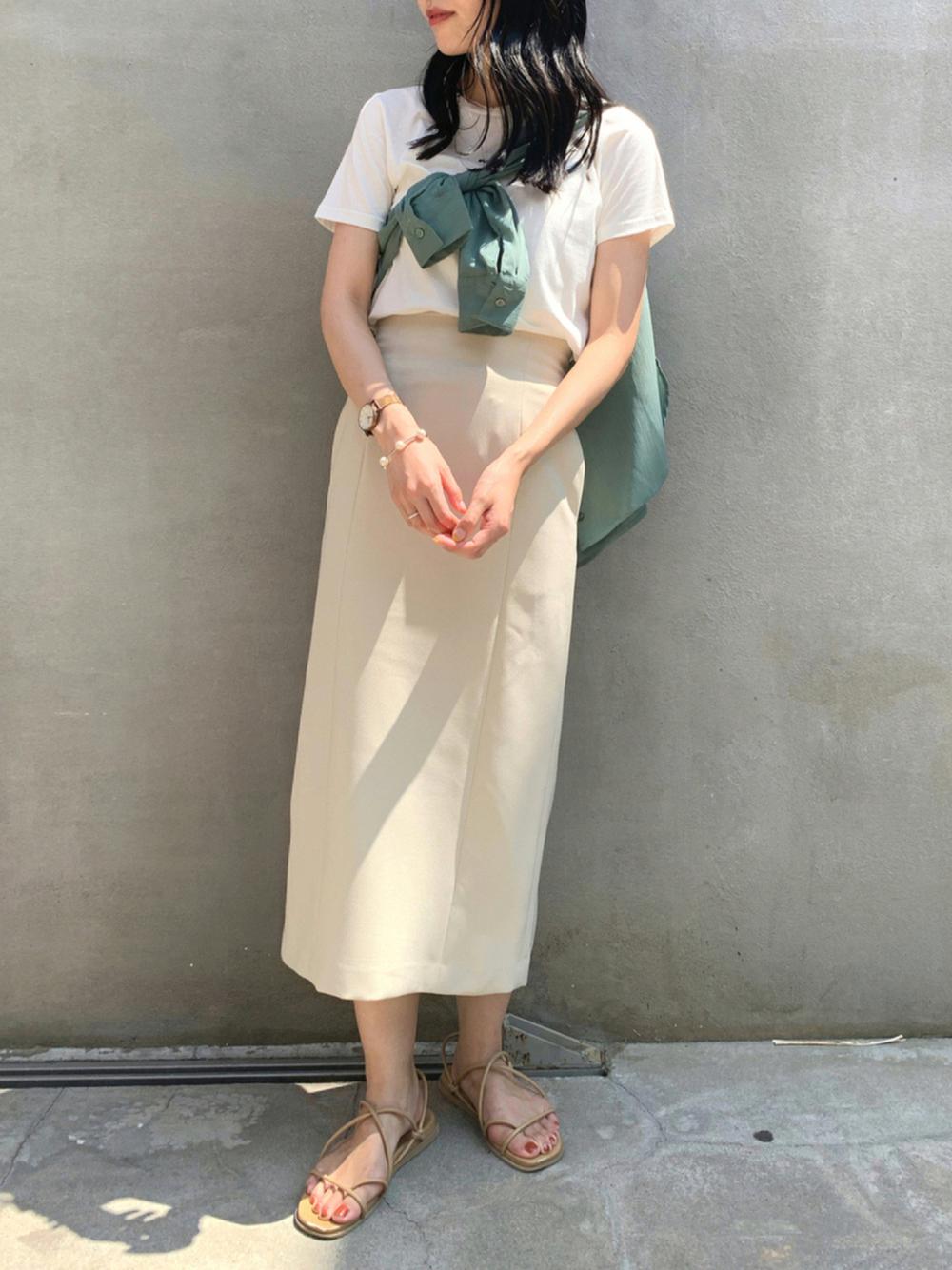 トップスに明るい色を持ってくることで、目線が上に行きスタイルアップが狙えます◎同系色でコーデをまとめることですっきりとした印象に。
