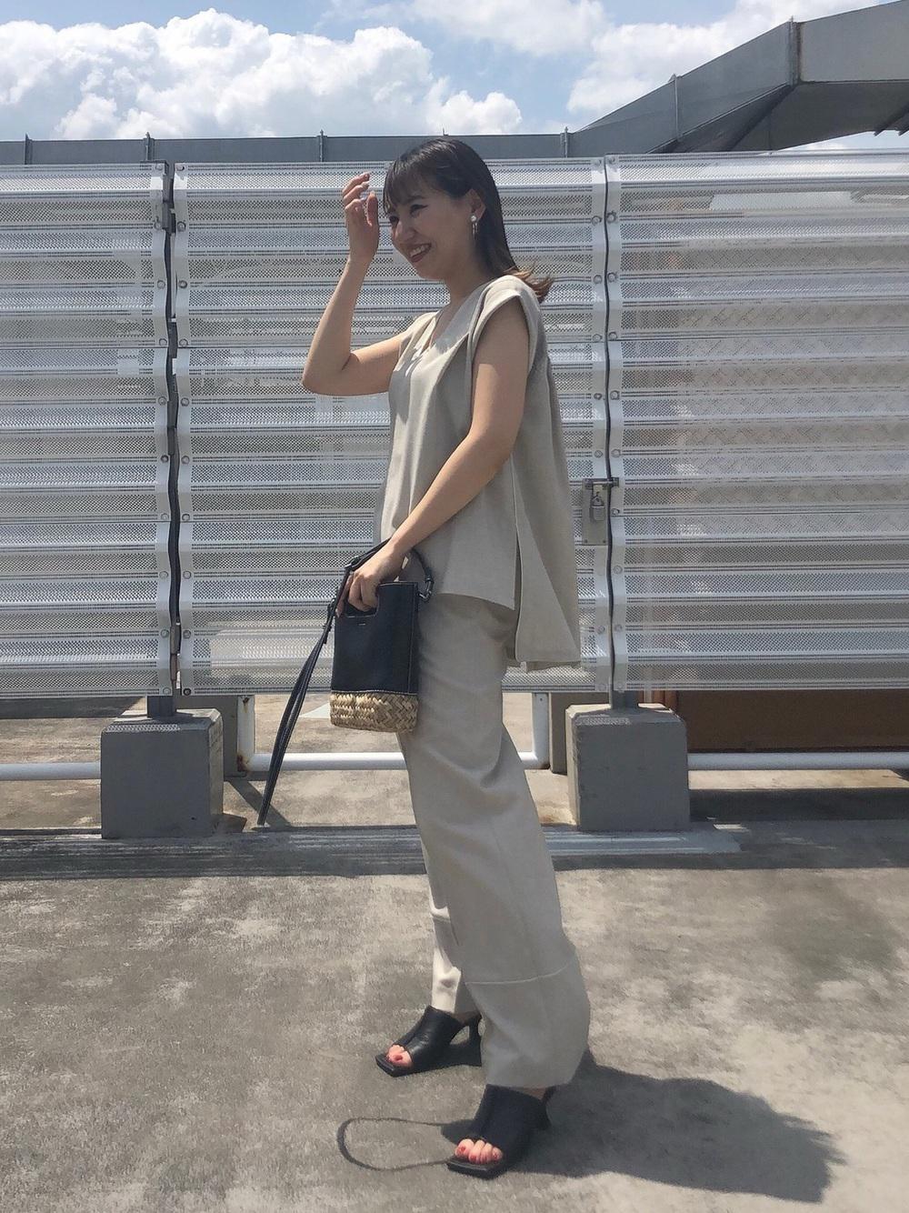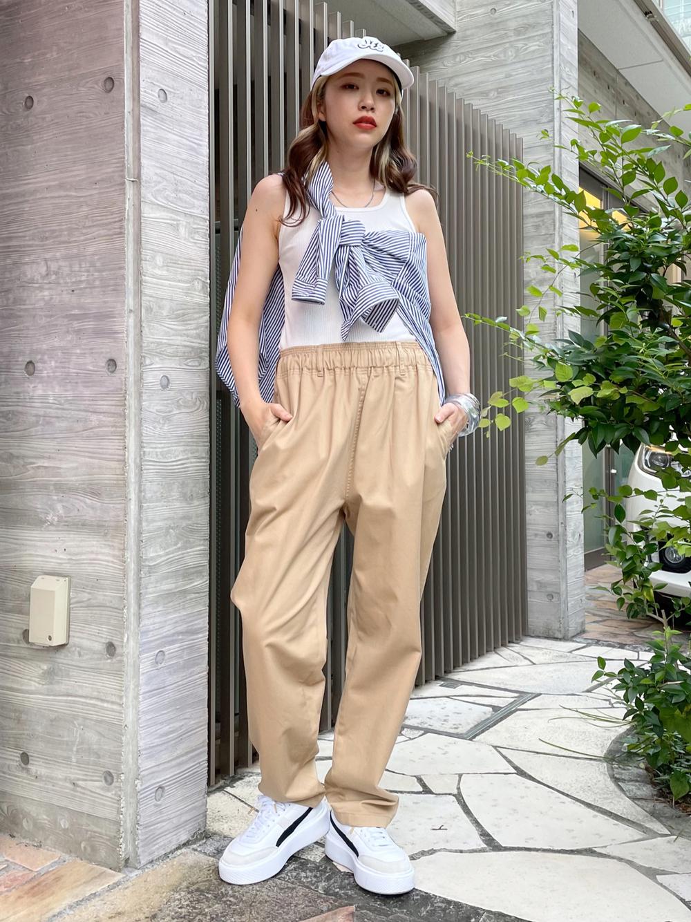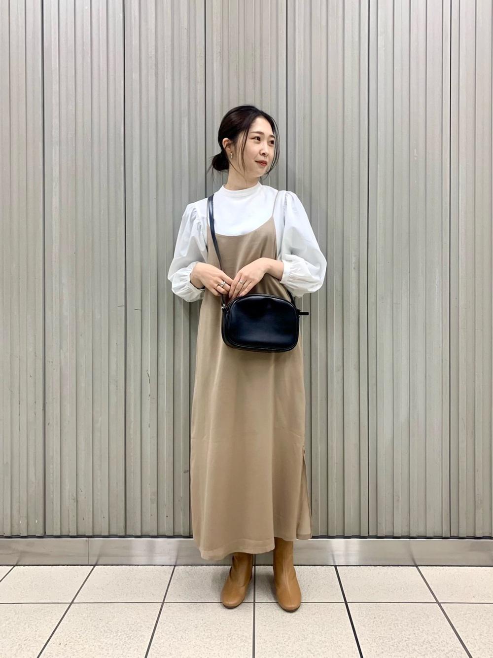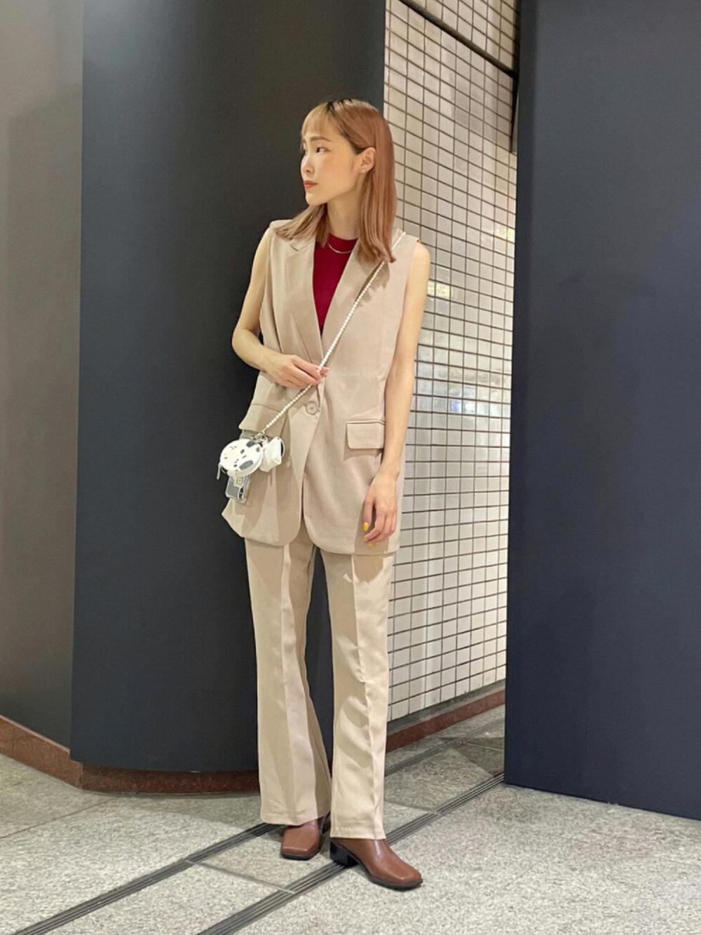 トップスに明るい色を持ってくることで、目線が上に行きスタイルアップが狙えます◎同系色でコーデをまとめることですっきりとした印象に。
