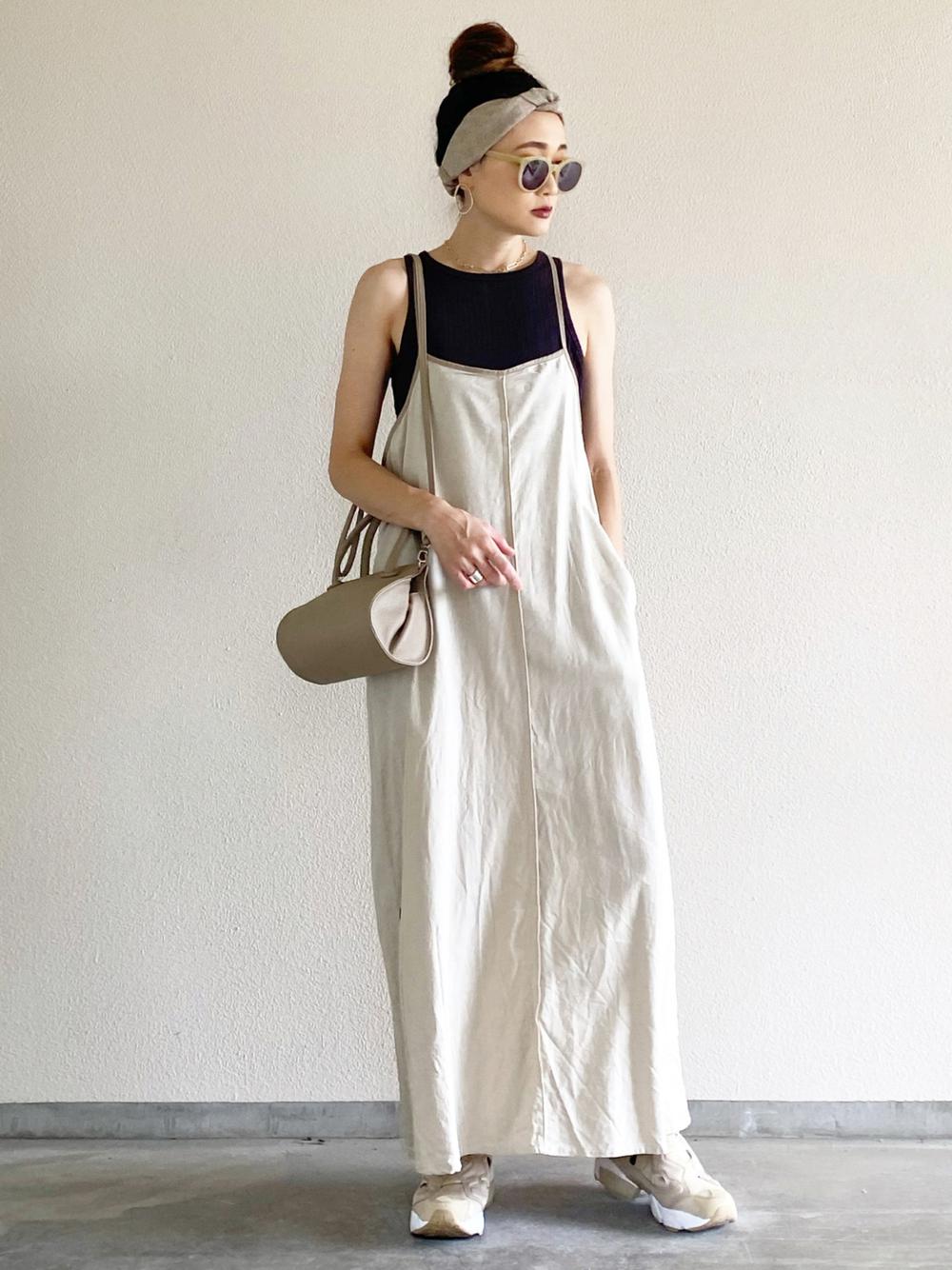 トレンドのキャミワンピもインナーを白にすることで、爽やかな印象に♪バッグや靴など小物を黒にすると引き締め効果が出ます◎