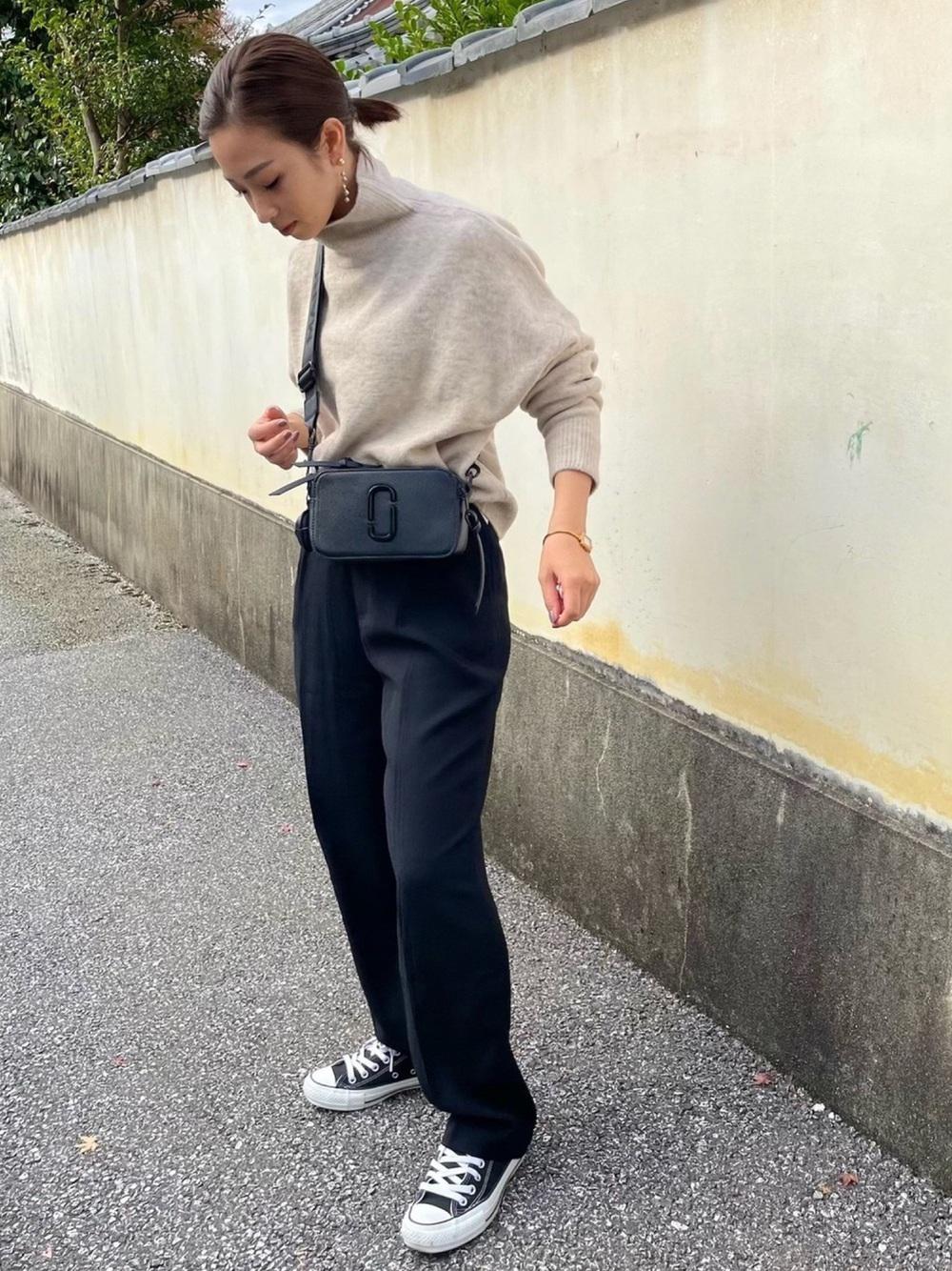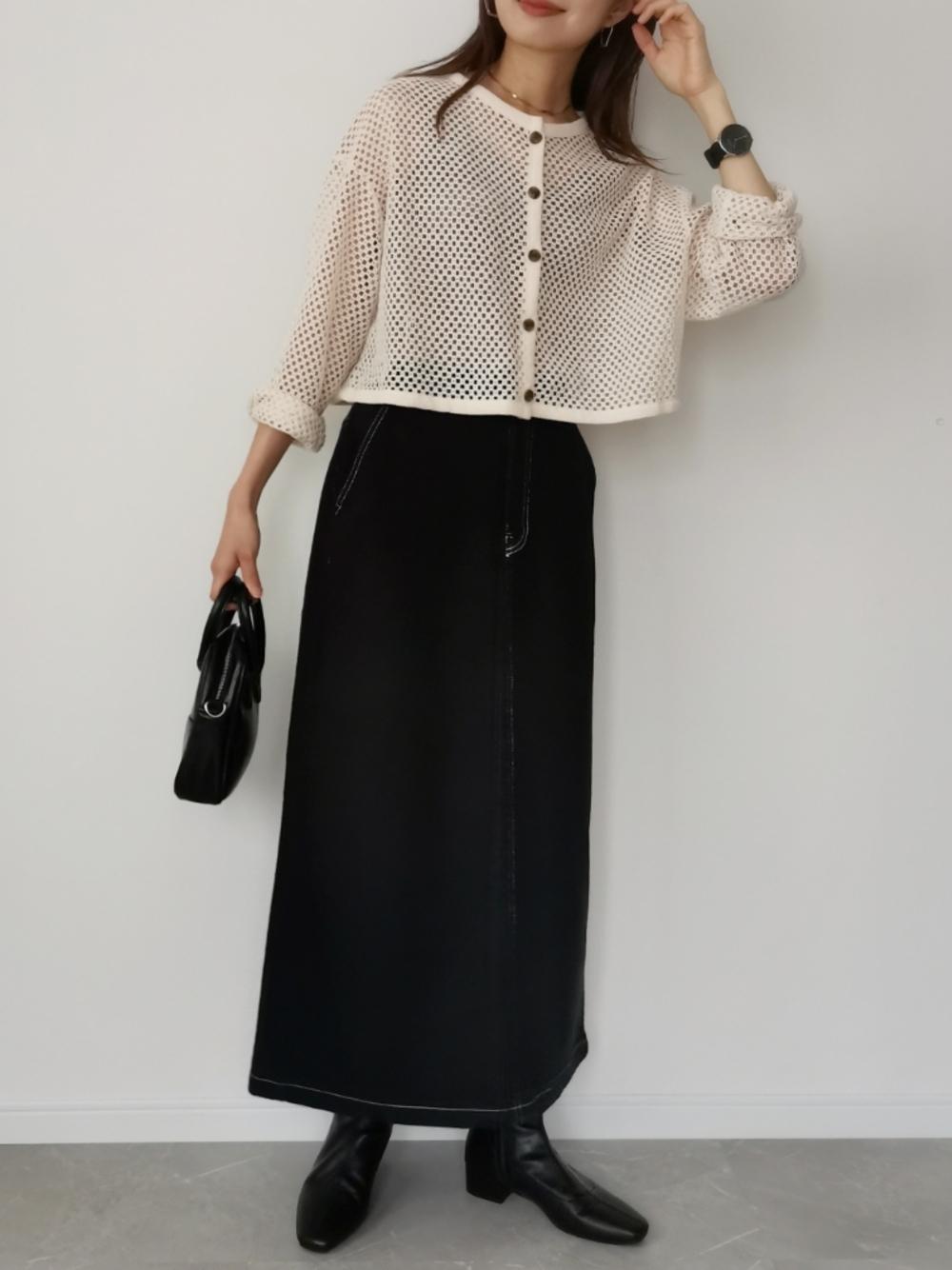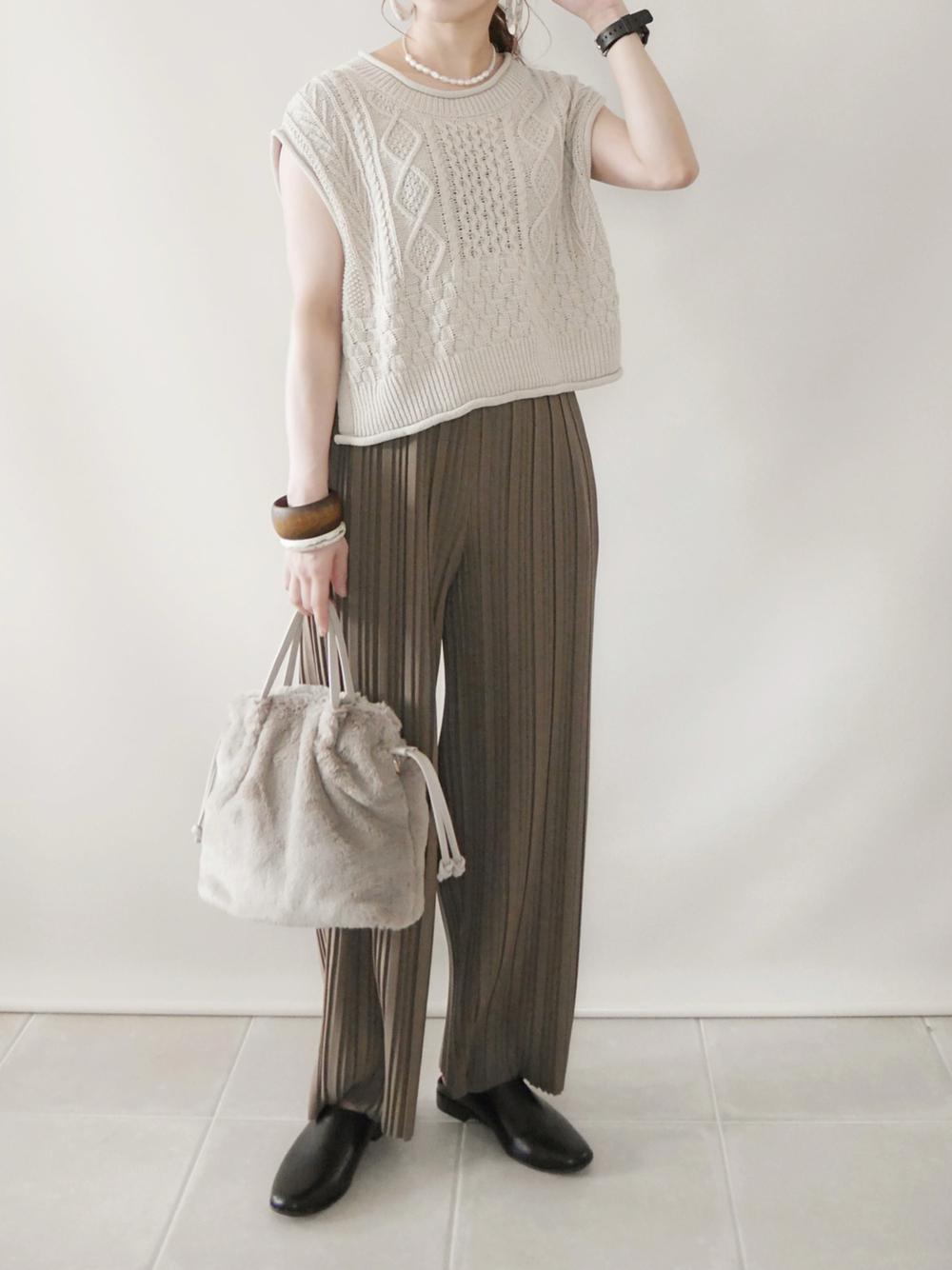 下半身の体型が気になる方はボトムス黒にすると◎着痩せ効果があり、ベージュとの相性も抜群です♪