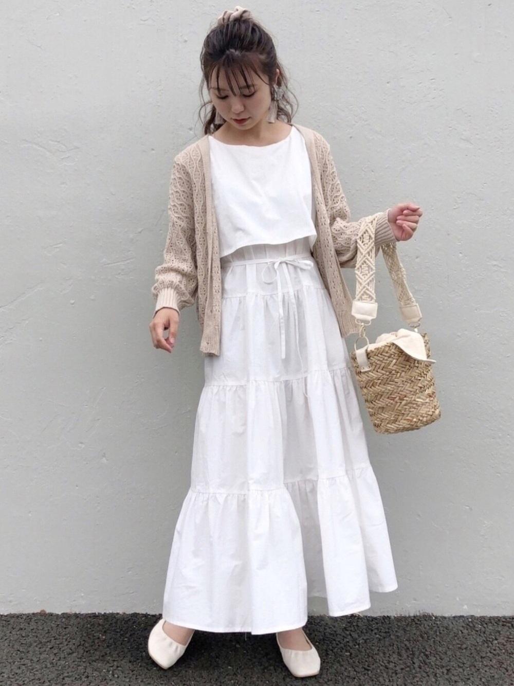 フェミニンなスタイルが好きな方におすすめなのがこちら!今期大流行しているティアードスカートにベージュのカーディアンを合わせることで女性らしい大人フェミニンコーデの完成♡