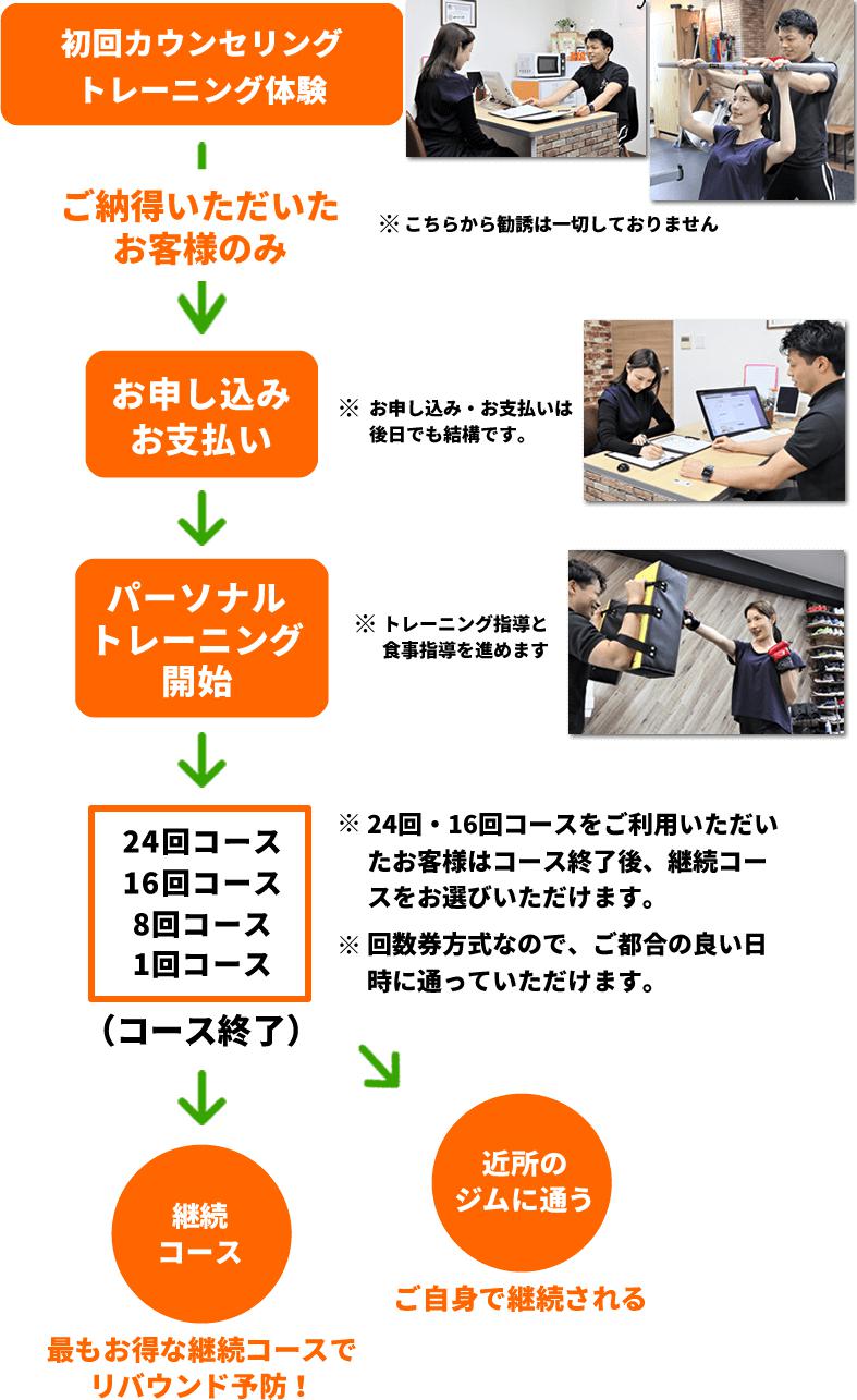 fis大阪へ入会するには、初回カウンセリングとトレーニング体験への参加が必須となります。利用までの流れは以下の通りです。