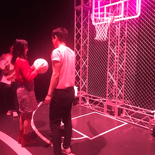 実際に、バスケのシュートゲームに挑戦!なんと1発目で決まって思わず大喜びしちゃいました♪