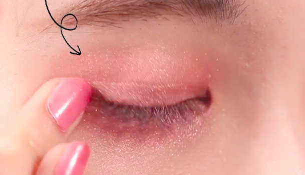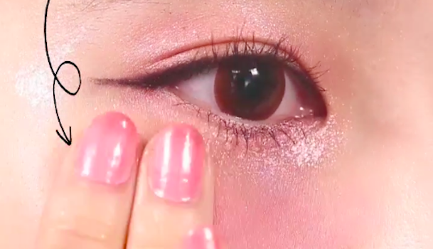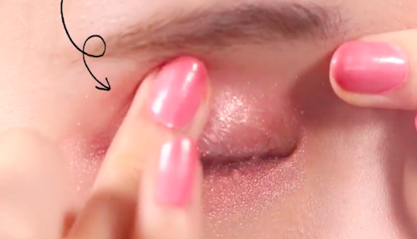ピンクのアイシャドウを上下のまぶた全体に指でぬります。