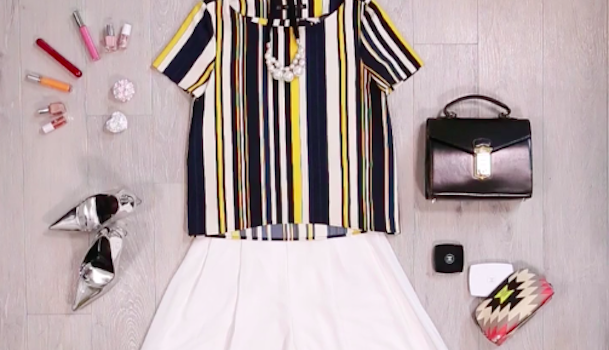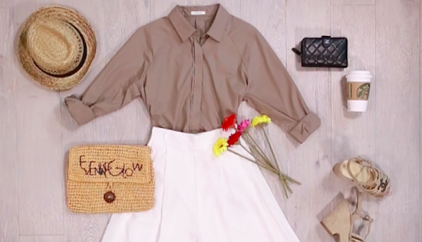 最後は「大人キレイめコーデ」。落ち着いたベージュカラーのシャツをインしてスタイルUP♪涼しめアイテムを合わせて大人の余裕を出しましょう。
