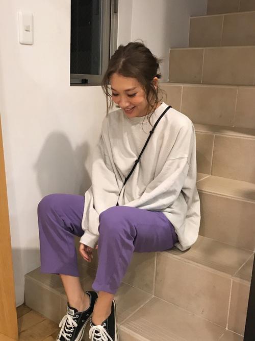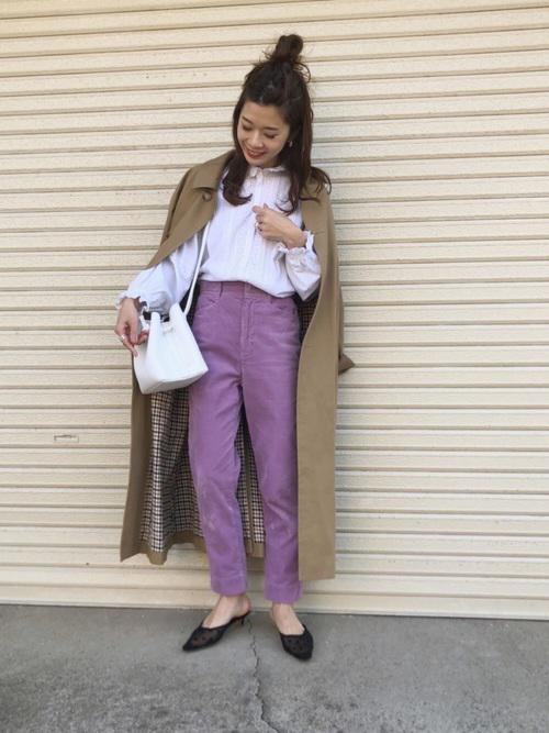 パンツがアクセントのきれいめコーデ。明るめのパープルのパンツで、女性らしさもかわいらしさもゲットできますよ。