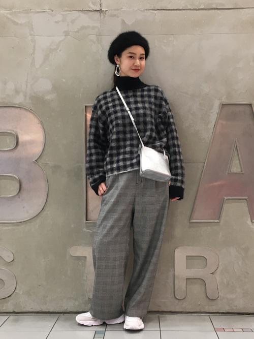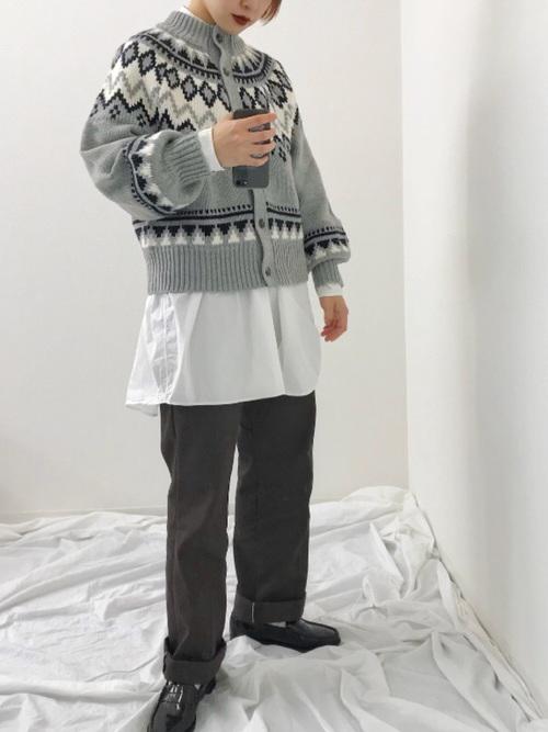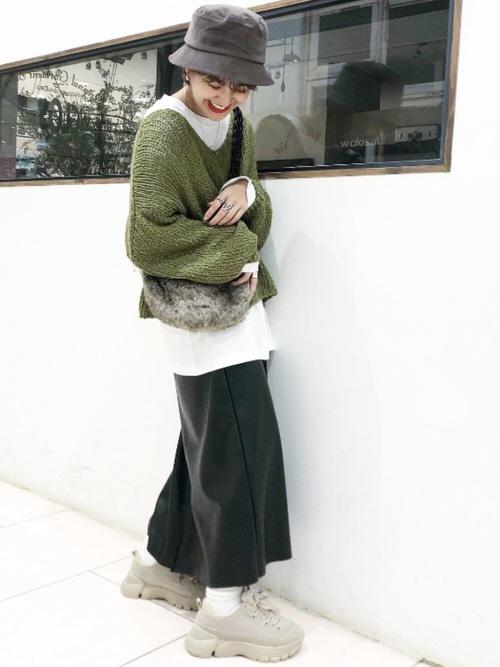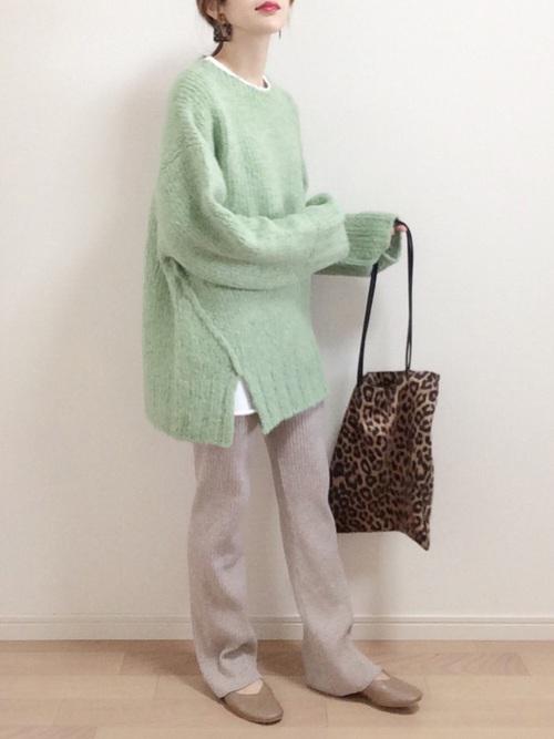 存在感のあるグリーンのニット。セーターにボリュームがあると、バランスの良いコーデになりますよ。好きなカラーのセーターを見つけてみてはいかがでしょうか!