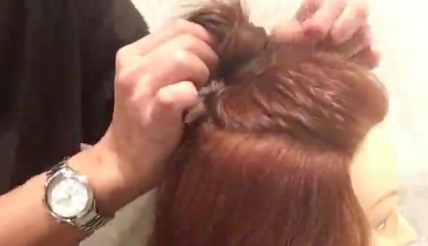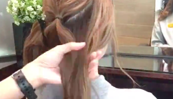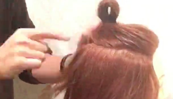 頭頂部からVの形に髪の毛をとり、ハーフアップみたいなイメージで結びます。この時耳前の髪は残しておきましょう。その後、ゴムを抑えながら少しずつ表面の髪を細くとってほぐし、ヌケ感を出していきます。
