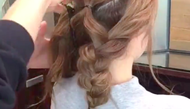 右の三つ編みも同様に手順2で結んだポニーテールと左の三つ編みの間にできた空間をピンで固定します。2つの三つ編みが交差して留まっている形になっていたらOKです。