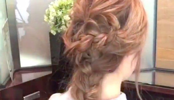 三つ編みをした毛先からうなじに向かって、くるくると内側に丸めていきます。