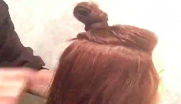 先程2で結いたポニーテールの毛先も一緒に半分に髪を分けていきます。