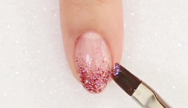 赤のラメを使ってグラデーションを作っていきます。爪の真ん中から上にラメを塗っていきましょう。先端に自爪が隠れるようにたっぷりとのせるとキレイなグラデーションができますよ。