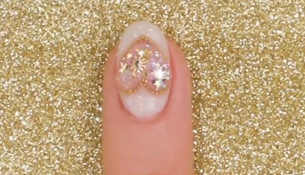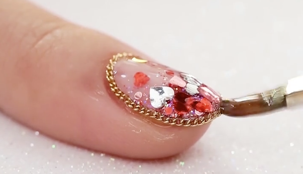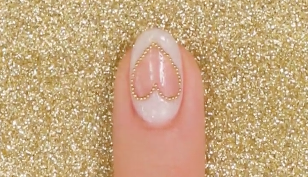 爪にクリアジェルを塗り、クリアとホワイトの境目にゴールドのブリオンをのせ、ハートを縁取ります。ピンセットを使って、丁寧に根気よくのせていきましょう。