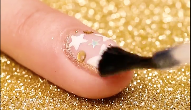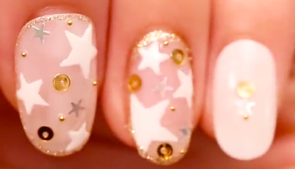ノリ代わりにトップコートを爪全体に軽く塗り、星のホログラムとゴールドのスパンコールと小さいブリオンをのせます。(2)で貼ったシールの間にランダムにのせていくことがポイントです。全体のバランスをみながらパーツをおいてくださいね。