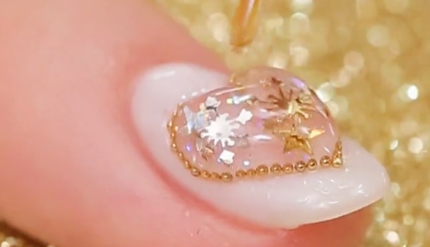 (3)の上からトップジェルを塗り、雪の結晶のパーツをのせます。大小2つ、色違いをのせることがポイントです。なるべく星のホログラムと被らないようにのせてください。