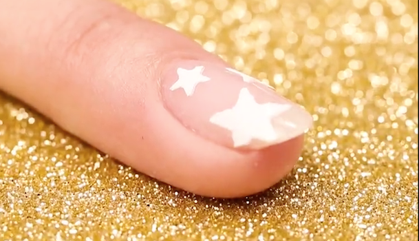 サイズの異なる星のネイルシールをランダムに貼っていきます。爪からはみ出てしまったシールはハサミでカットして、爪の中にシールを収めましょう。ベースカラーがシアーホワイトなので白系のシールを使うことをオススメします。