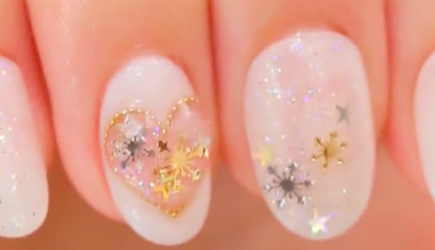 ハートの中の部分にラメを塗り、再びピンセットを使って星のホログラムをのせていきます。自分の好きな色・サイズのホログラムをランダムに数個おいてくださいね♪