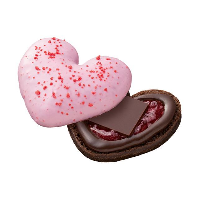 ふんわりほどける口どけのプレミアムハートココア生地にビターガナッシュといちごジャム、生チョコレートをサンドしました。ストロベリーチョコとストロベリートッピングで可愛らしく仕上げました。