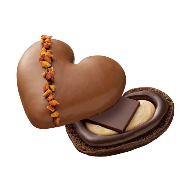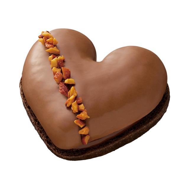 ふんわりほどける口どけのプレミアムハートココア生地にビターガナッシュとプラリネホイップ、生チョコレートをサンドしました。ミルクチョコとキャンディングアーモンドで優雅に仕上げました。
