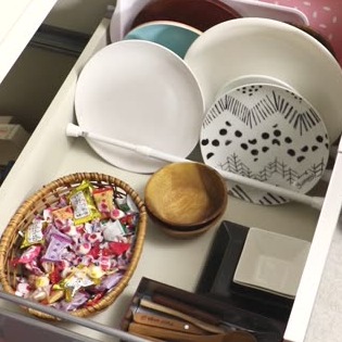 キッチンの食器収納に使える、つっぱり棒を使った裏技。食器収納棚につっぱり棒をいれるだけで、食器が立てかけられるので収納棚もスッキリします!