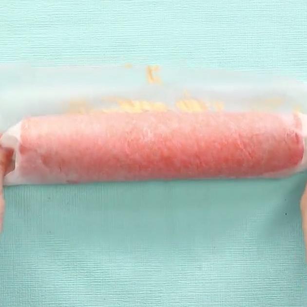 できたホイップクリームを、手順2の生地にのせ、ロールしていきます。