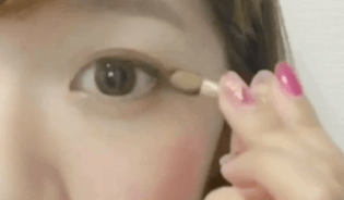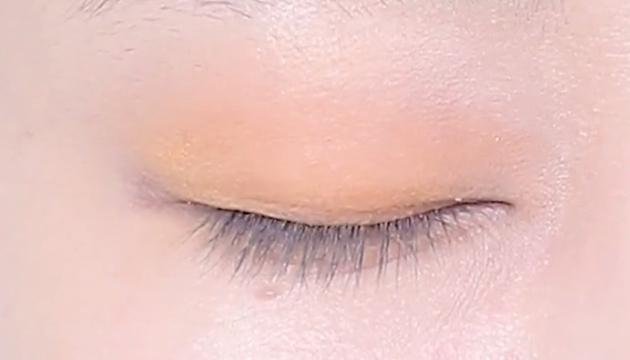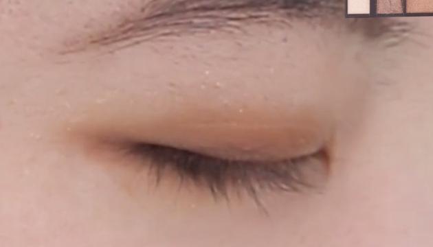 次にのせるのは、右上のベージュカラーです。二重幅より少し広めにのせるのがGOOD。