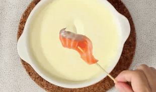 サーモンをチーズフォンデュにつけるという発想はなかなか出てこないですよね。