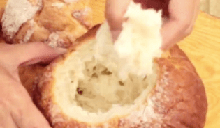 パンの上部をカットし、中身をくり抜きます。