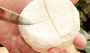 カマンベールチーズに包丁で十字に切込みを入れて、カマンベールチーズをまるごと先ほどくり抜いたパンの中に入れます。