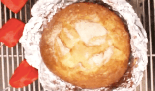 パンをアルミホイルで包み、先ほど切り落としたパンの上部分をフタのようにのせて、網の上で温めてください。フタをすることによって、早く温まりますよ。