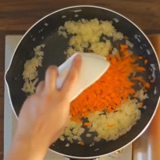 玉ねぎ、にんじんをみじん切りにします。フライパンにバターを入れて溶かし、玉ねぎとにんじんを加えしんなりするまで炒めます。