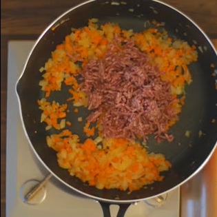 みじん切りにした玉ねぎ、にんじん、エリンギを加えさらに炒めます。野菜がしんなりしてきちんと全体に火が通ったら、水を加えて弱火で煮詰めます。