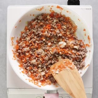 フライパンでオリーブオイルを熱し、ひき肉を炒めるます。お肉がパラパラになりすぎないよう、火力に注意しましょう。