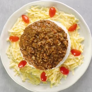 耐熱皿にごはんを盛りルウをごはんの上にのせます。ピザ用チーズと牛乳をまぜてまわりにかけ、ミニトマトを盛りったらトースター(600W)で3〜5分焼きます。